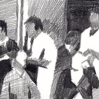 Elian: Es hablar del ser humano genérico. Repito y quiero volver a dejar en claro que hablo desde mi contexto específico espacio temporal. El pintar los rostros no pretende generalizar, pero si operar como una herramienta para permitir una identificación más directa con el espectador. Hablo de situaciones y contextos sociales más que de personas o grupos concretos. Por ejemplo, en la línea de dibujos a lápiz de igual formato, transcurren los sucesos, donde más que buscar una cronología, busco generar un horizonte de sentido que, de la idea de una situación, una atmósfera determinada. La que yo percibo del período de entre guerras en Europa. Repito, hablo de tiempos y lugares concretos, desde mi contemporaneidad.
